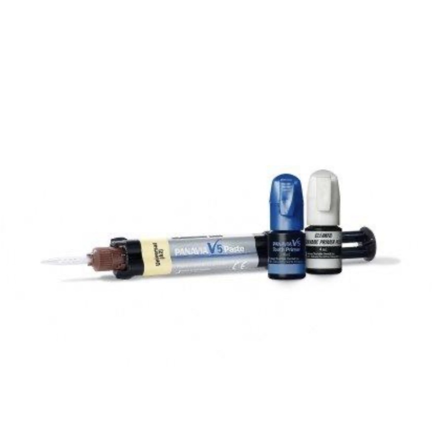 PANAVIA V5 kit intro A2: jeringa 2.4 ml, Tooth Primer 2 ml, Clearfil Ceramic Primer plus 2 ml, 10 puntas de mezlca, 10 puntas endo, 50 cepillos aplicadores..